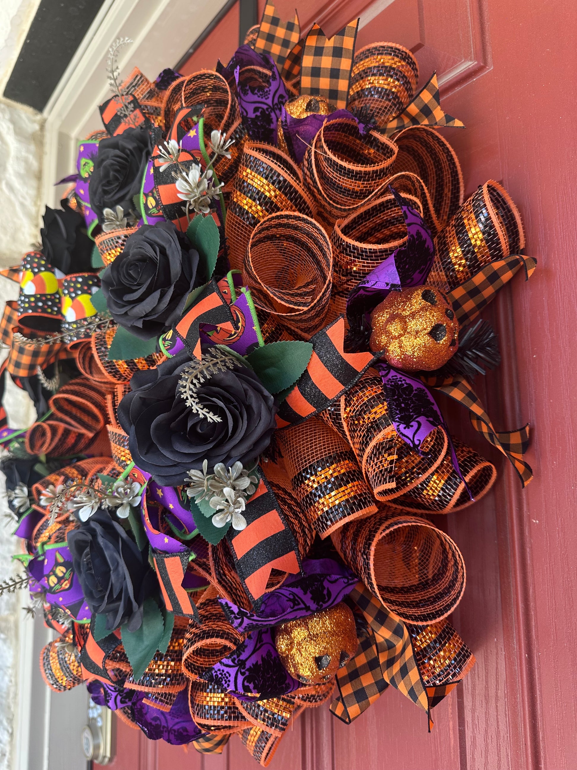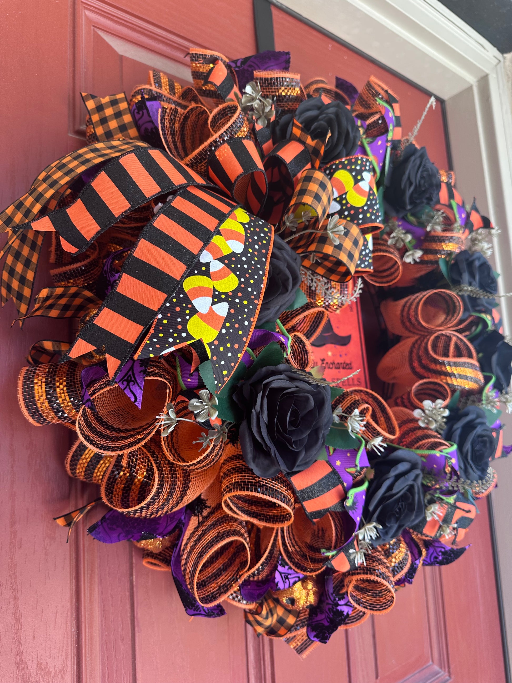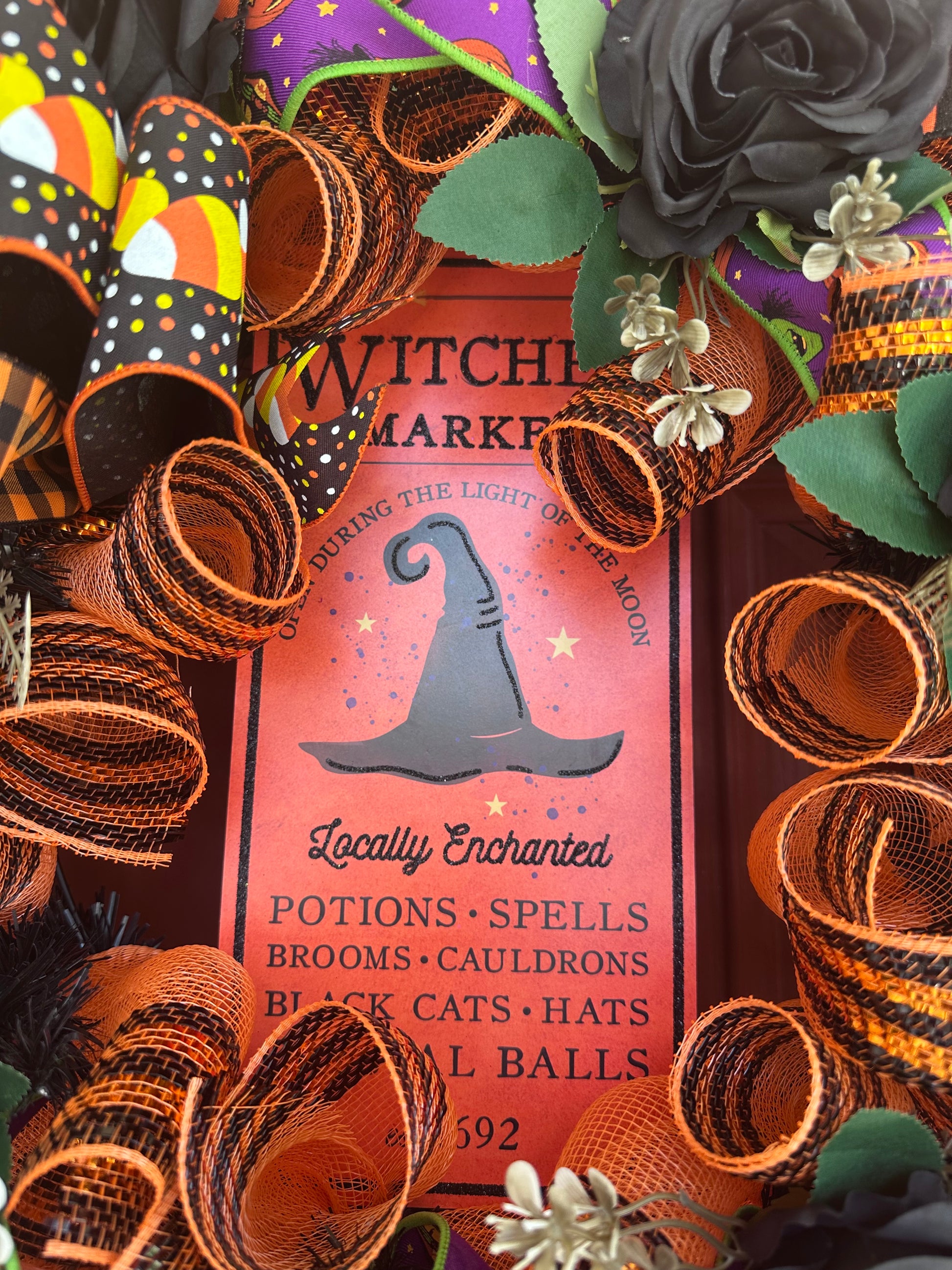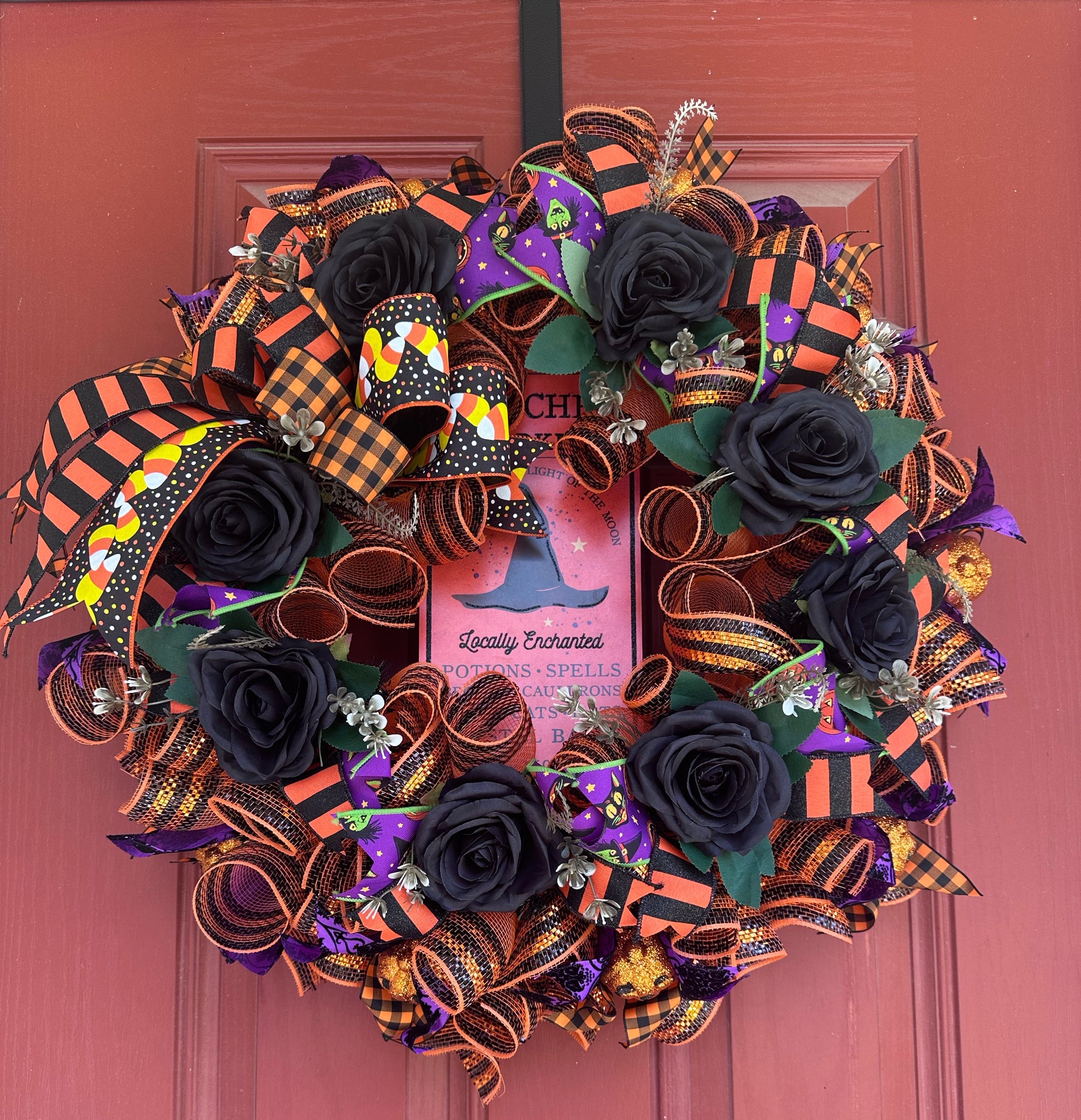 Celebrate the spirit of Halloween with this expertly crafted wreath featuring a charming witch hat sign as its centerpiece. Accented with vibrant, bright Halloween-colored ribbons, it adds festive energy to any door. Complemented by elegant black roses and miniature pumpkins, this wreath blends classic Halloween motifs with sophisticated design elements, making it a perfect seasonal decoration that captures attention and sets a captivating tone for your holiday ambiance.