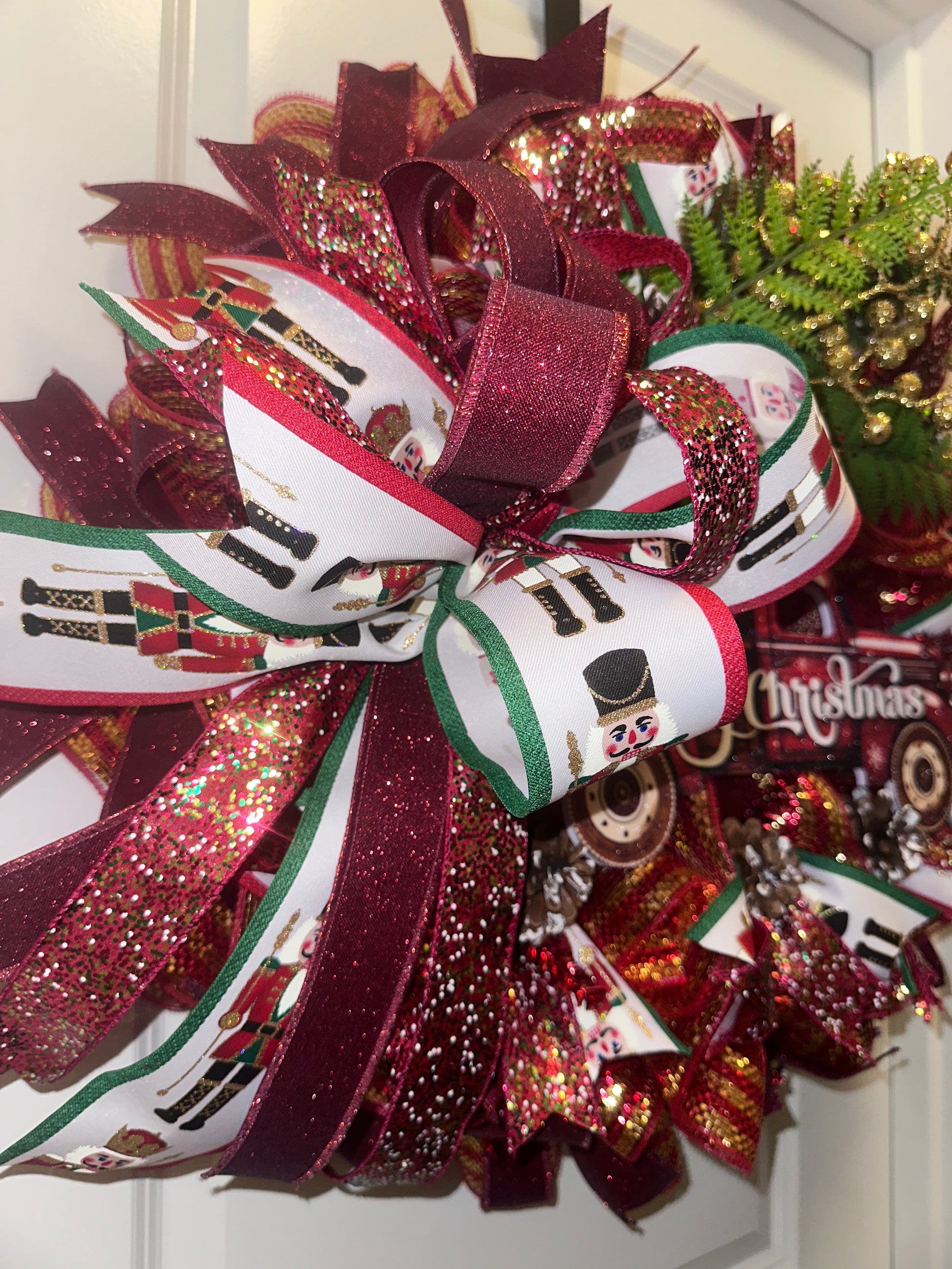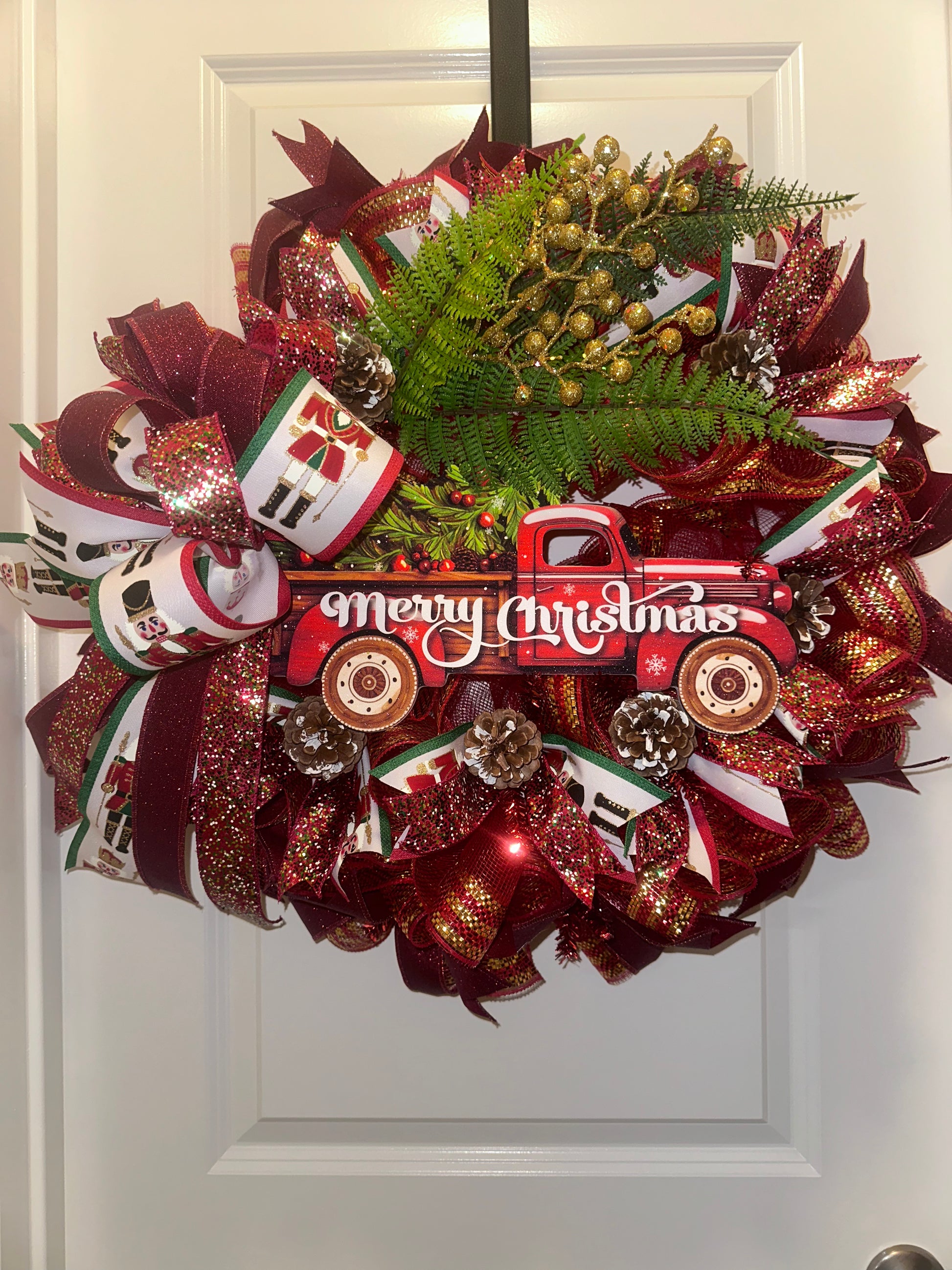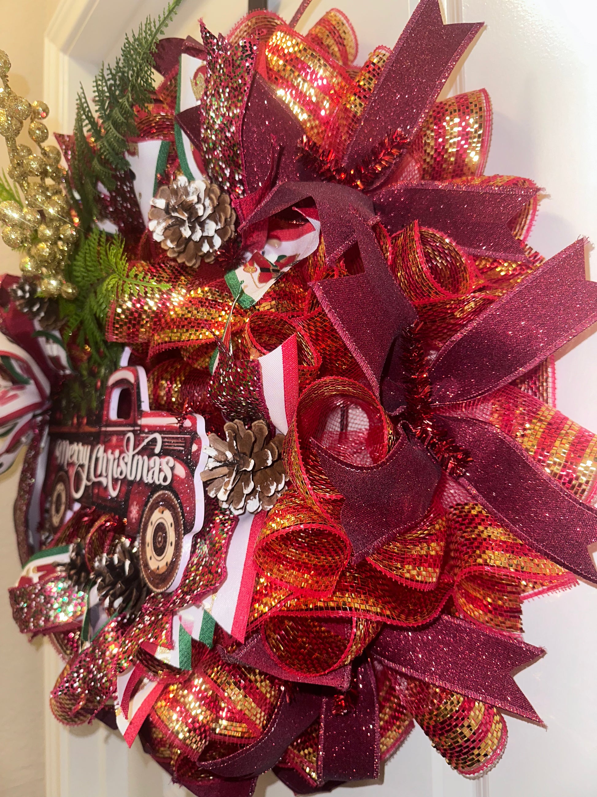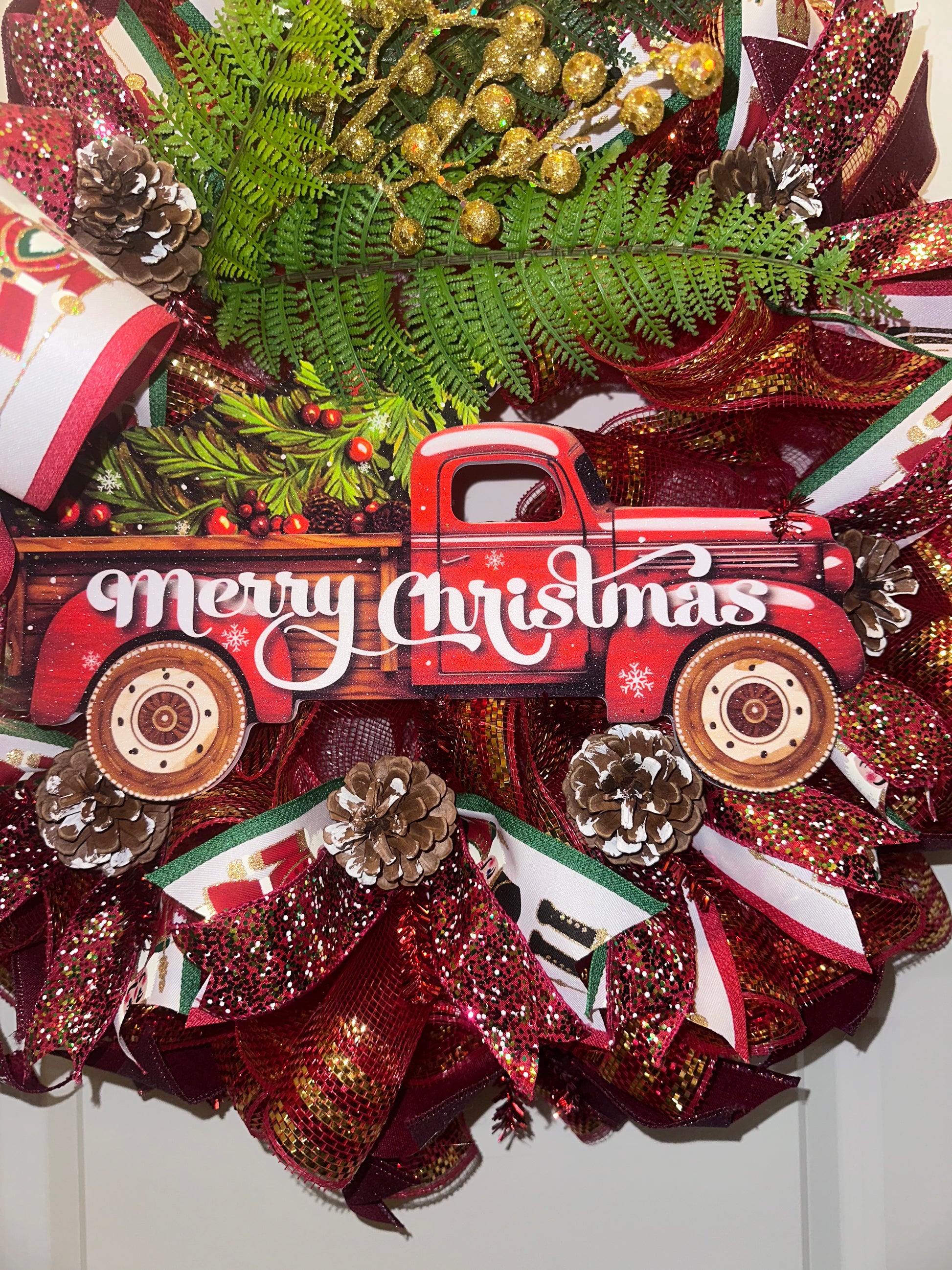 Elevate your holiday decor with our Merry Christmas Wreath. Crafted with a festive combination of red and gold, this wreath features gorgeous accents of gold berries, garland, and pinecones. The centerpiece is a charming red rustic truck carrying Christmas trees, adding an extra touch of holiday cheer.