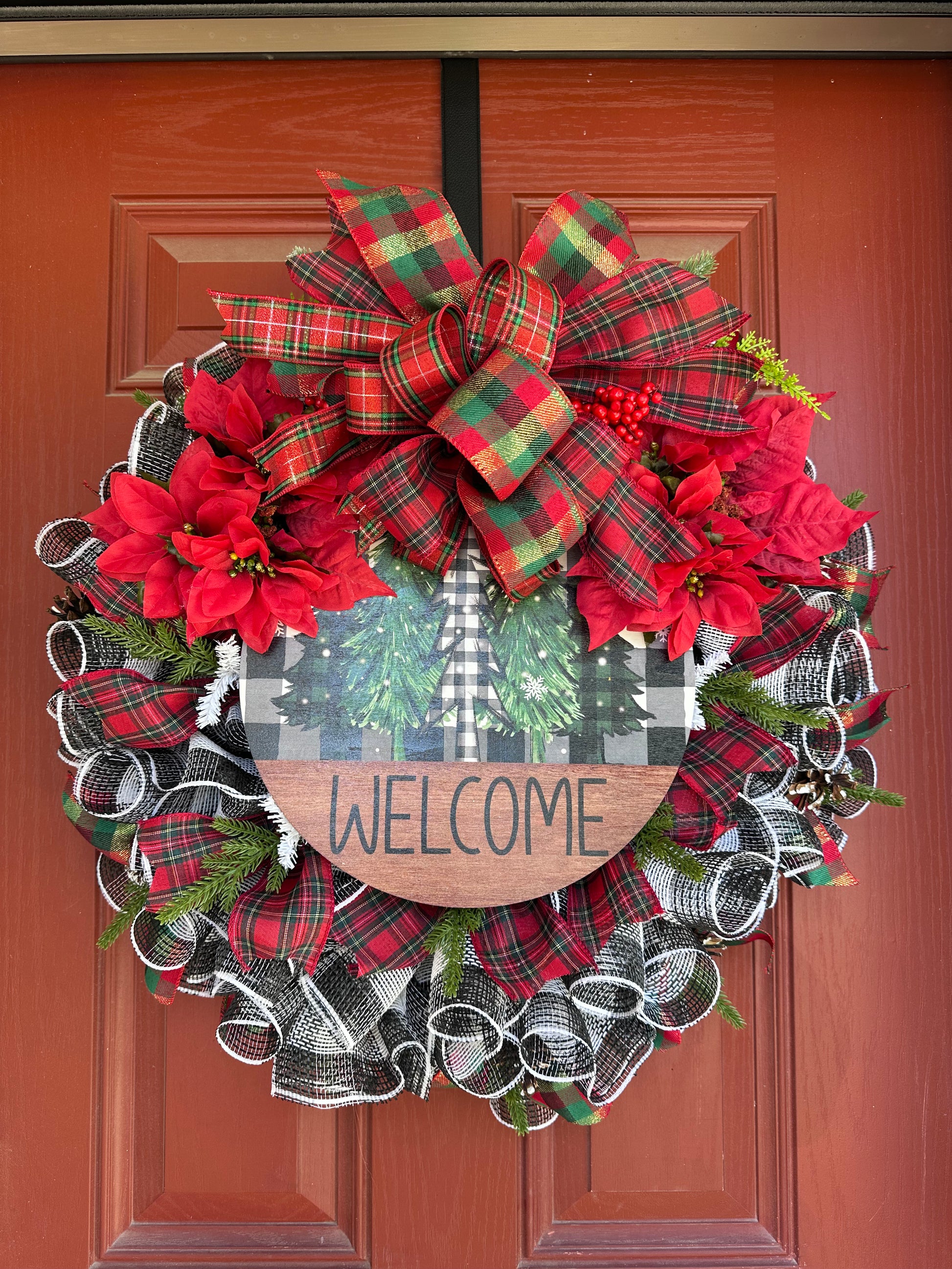 Welcome the holiday season with timeless charm! This handcrafted wreath captures the cozy spirit of Christmas with a bold plaid bow, lush red poinsettias, and festive greenery. The center features a rustic wooden sign adorned with evergreen trees and the word “Welcome,” creating a warm and inviting greeting for family and guests alike.