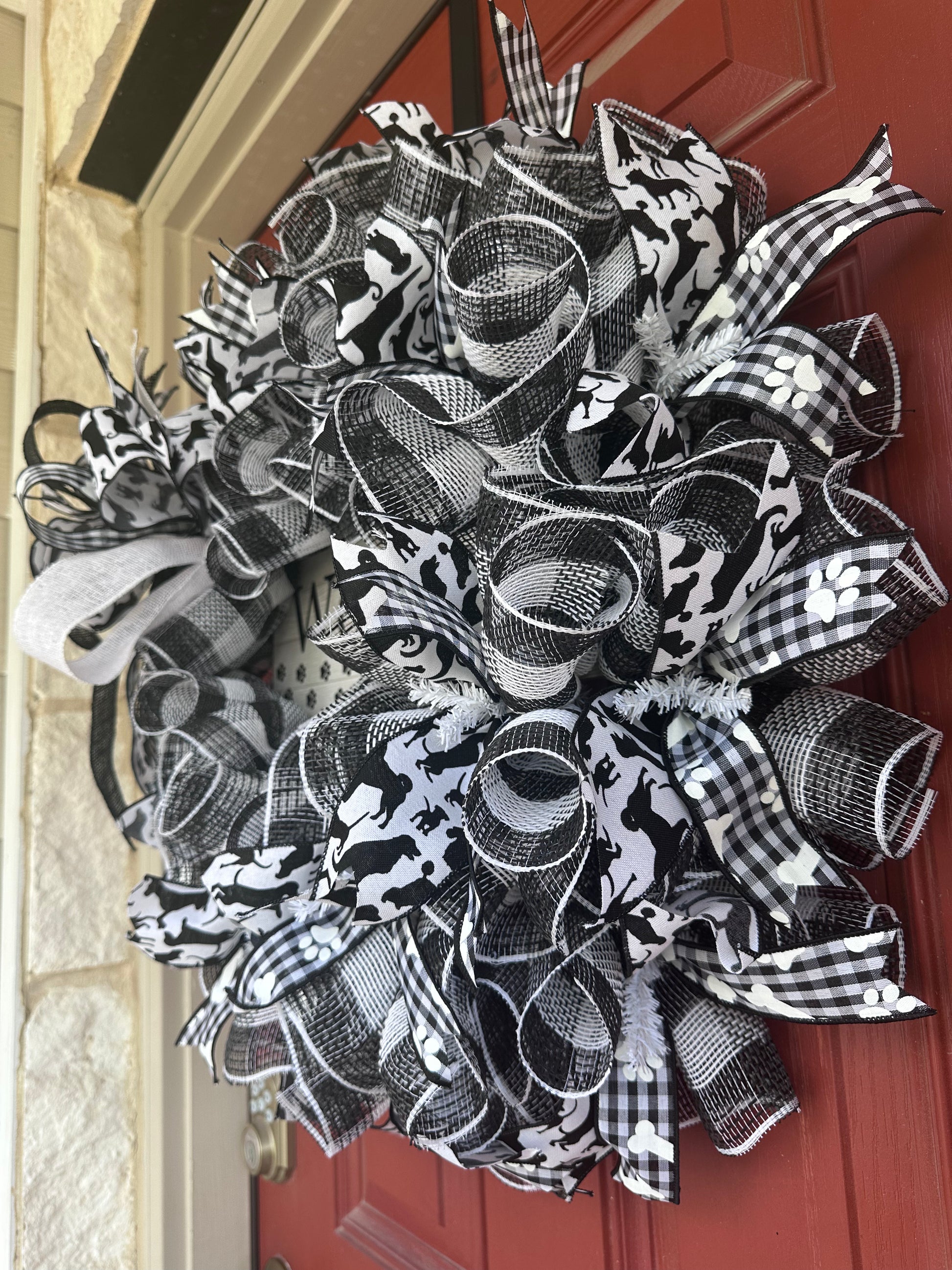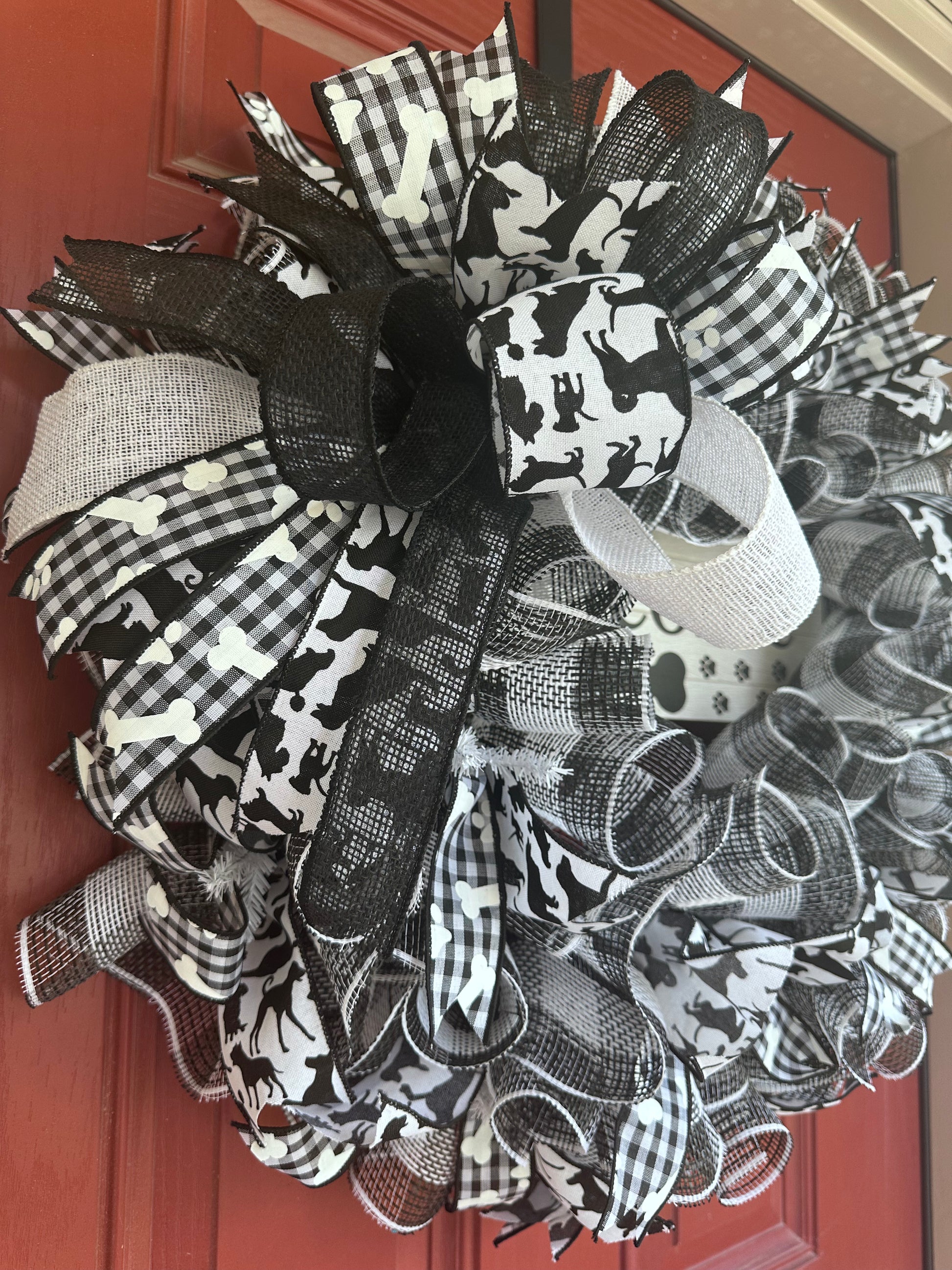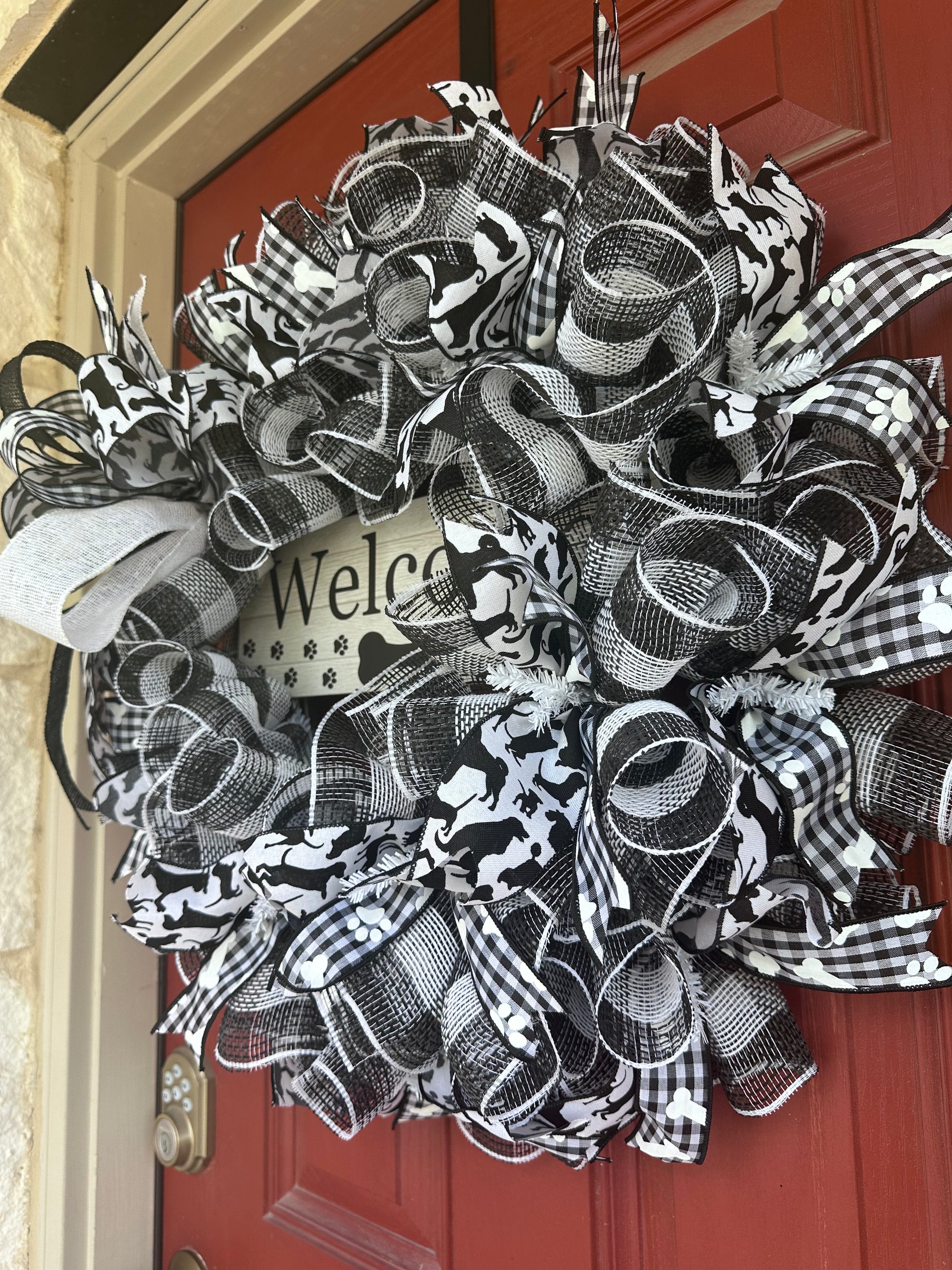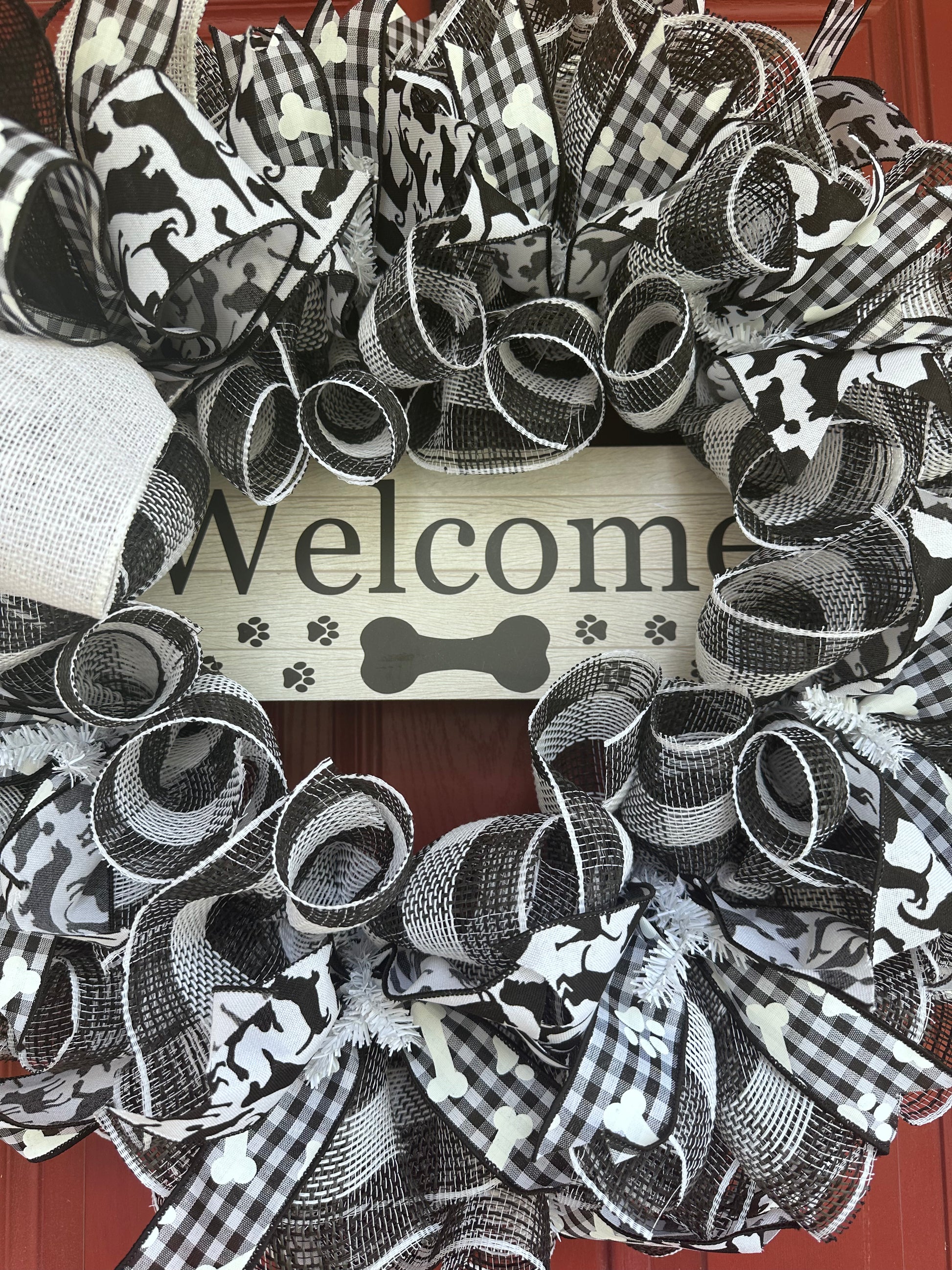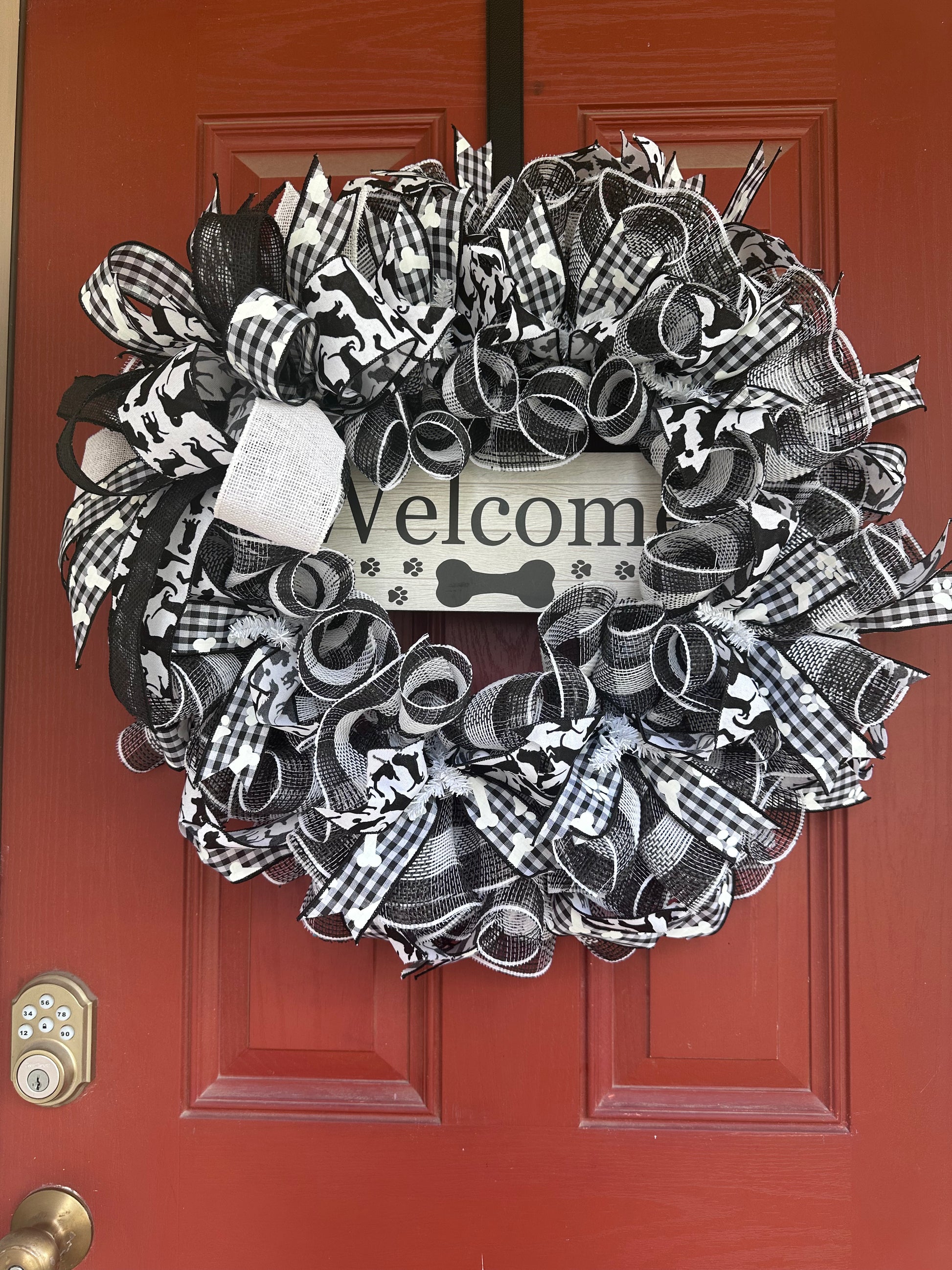 Welcome guests and their furry friends with our Welcome dog bone wreath. Featuring a charming dog bone sign and dog-themed ribbon, this wreath is perfect for any dog lover. Show your love for man's best friend with this beautifully crafted wreath.