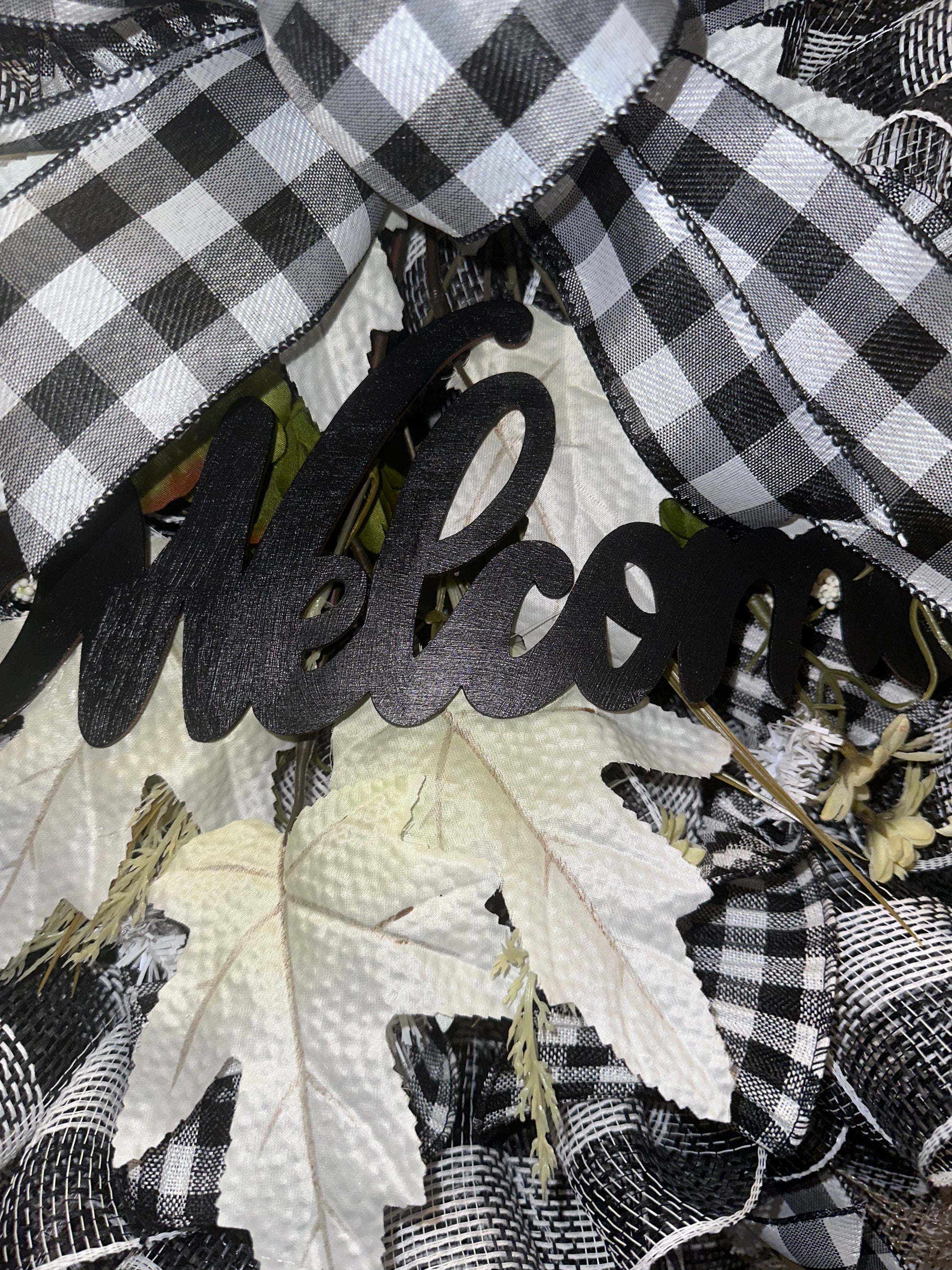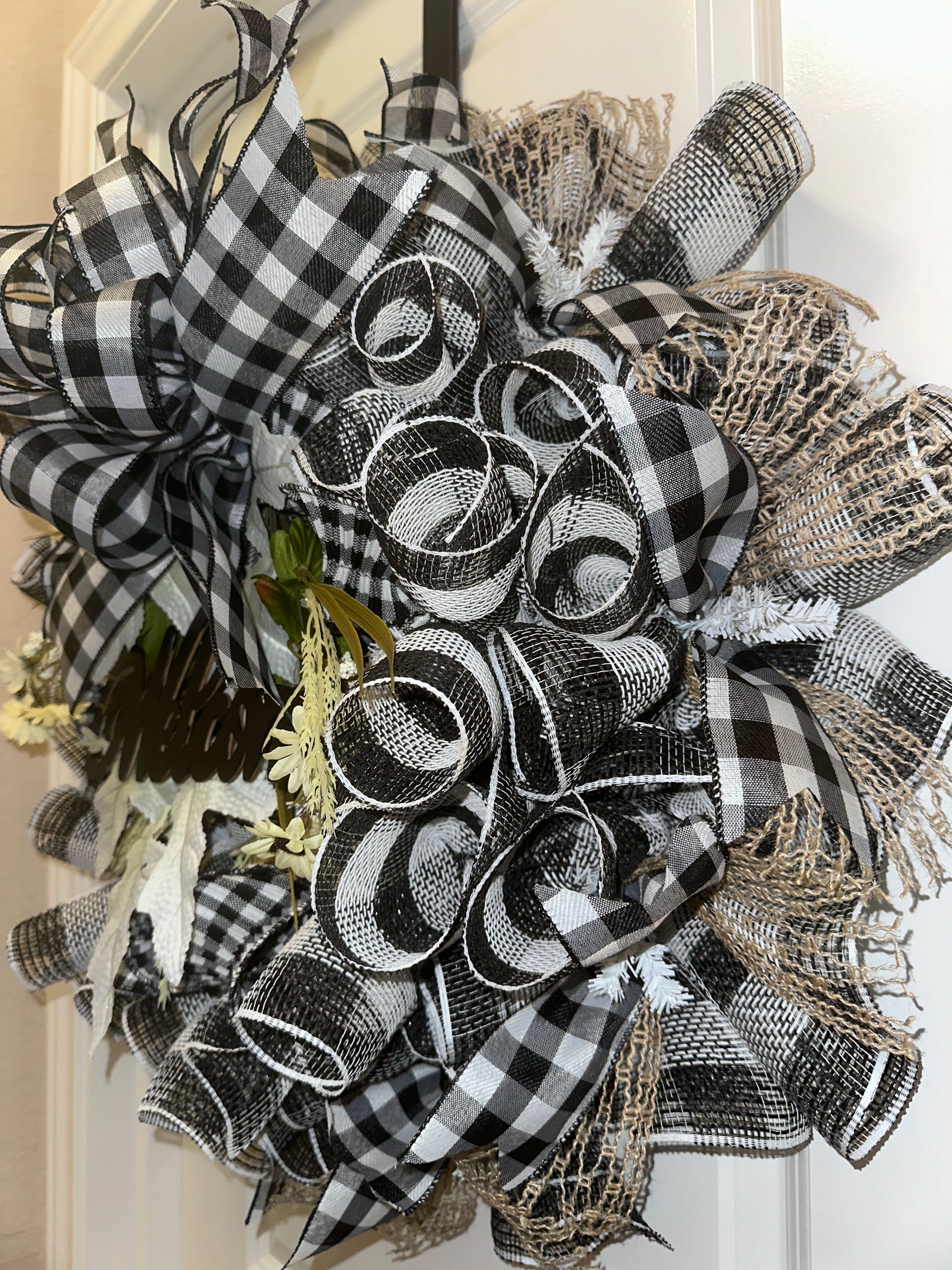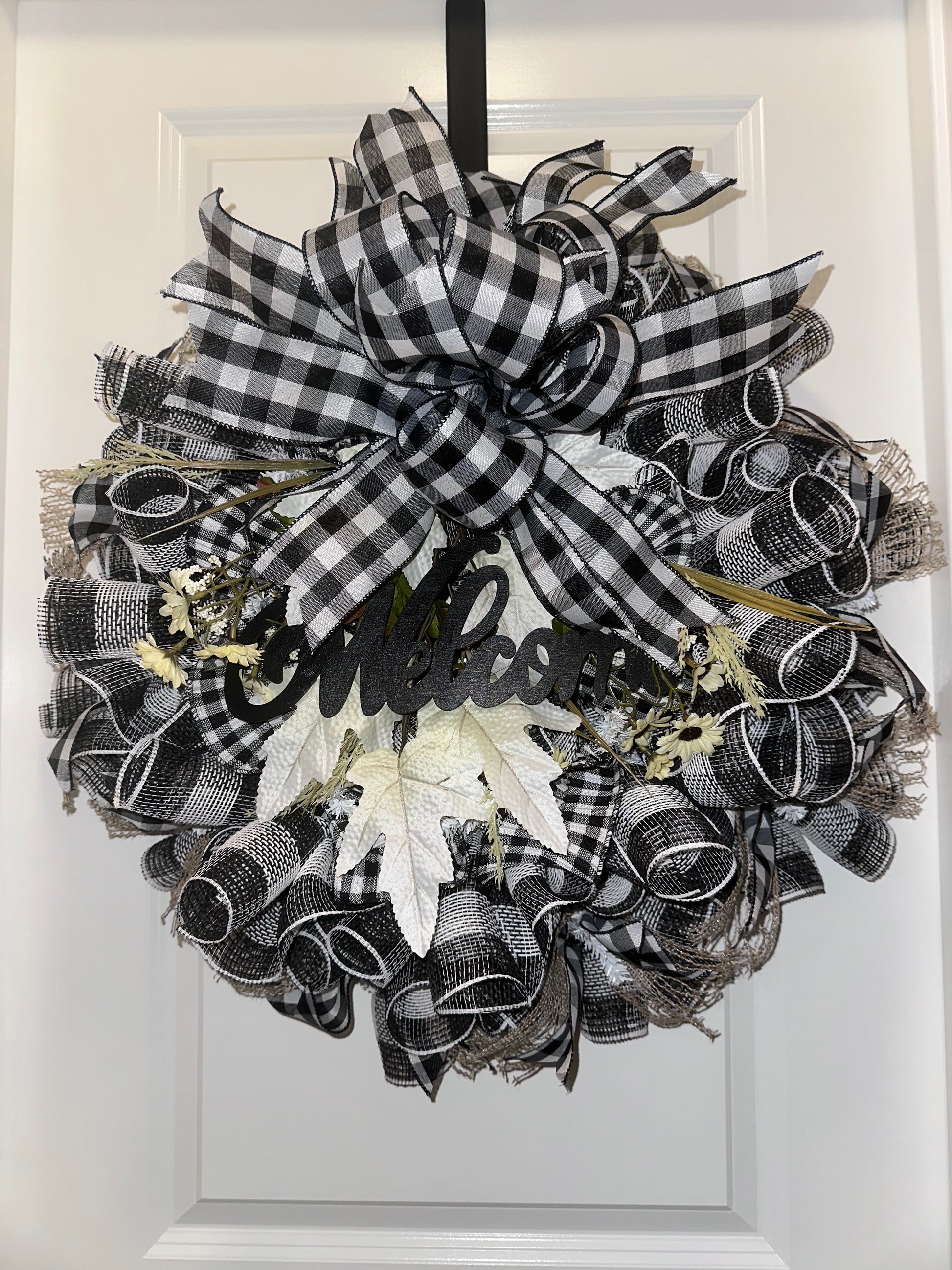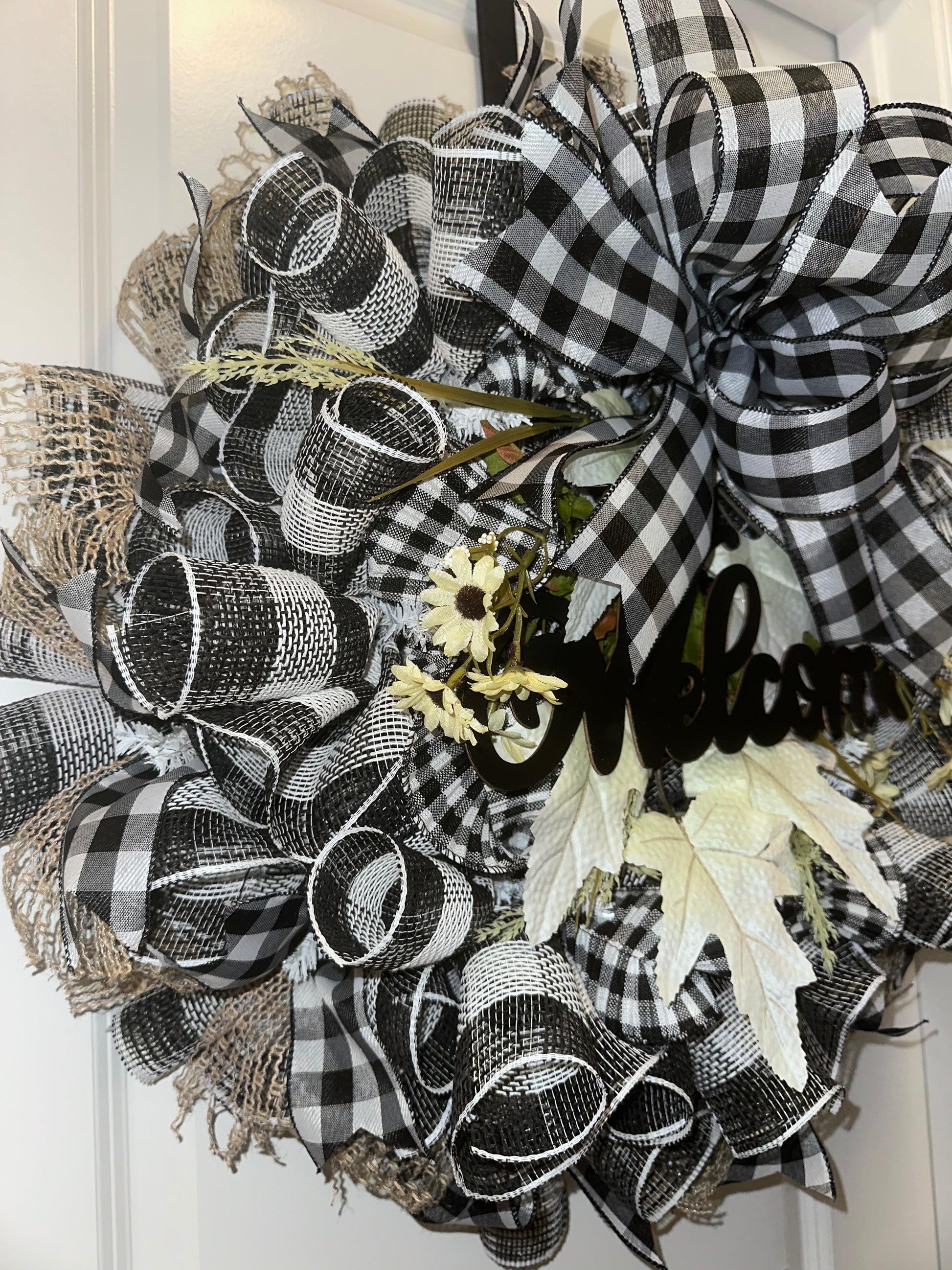 Welcome guests to your home with our rustic Welcome to Our Home Wreath. This charming wreath features a classic buffalo plaid design, accented with a hand painted wooden sign that proudly displays the word "Welcome" in elegant lettering. Adorned with white leaves, this wreath is a warm and inviting addition to your front door.