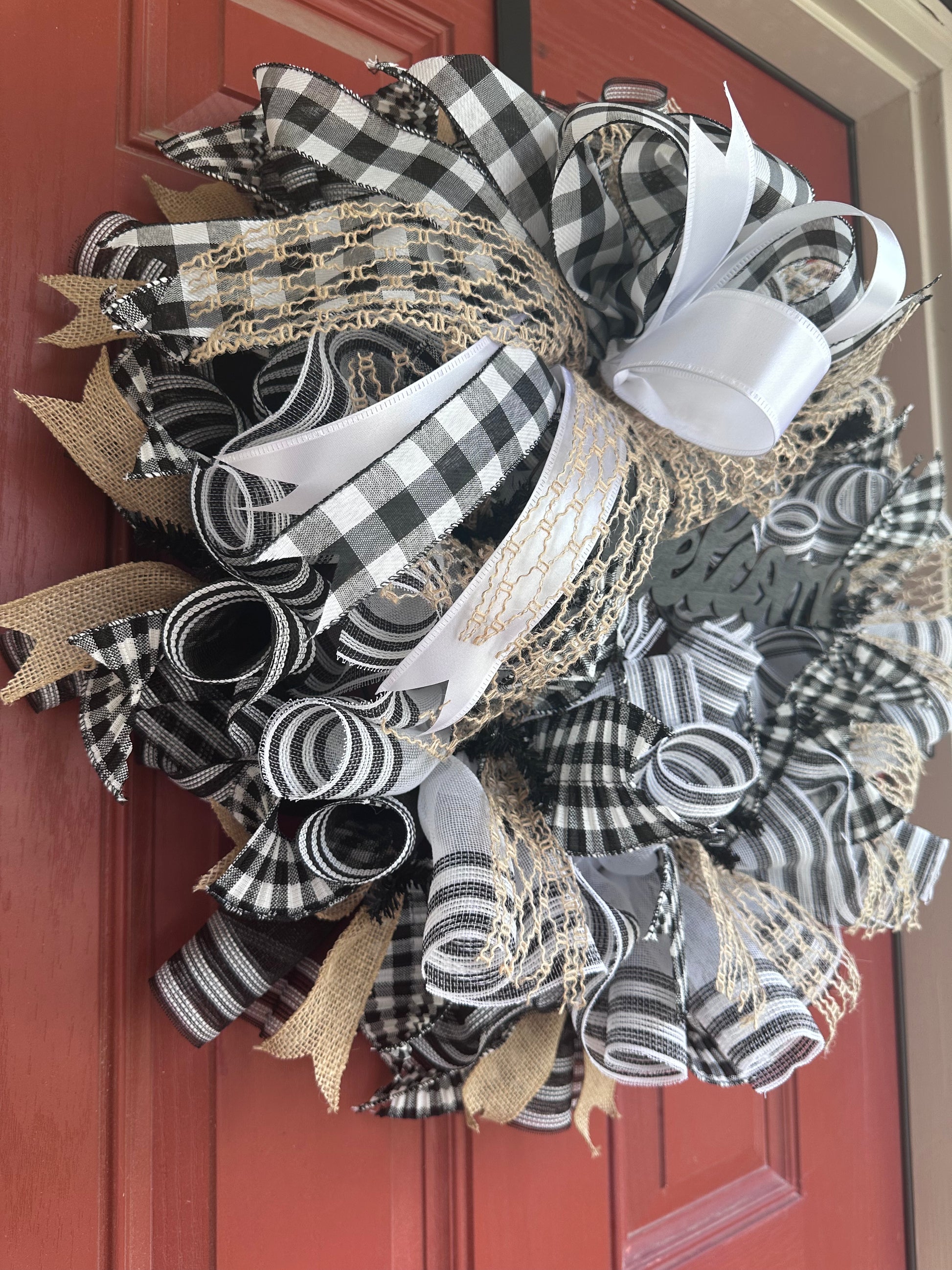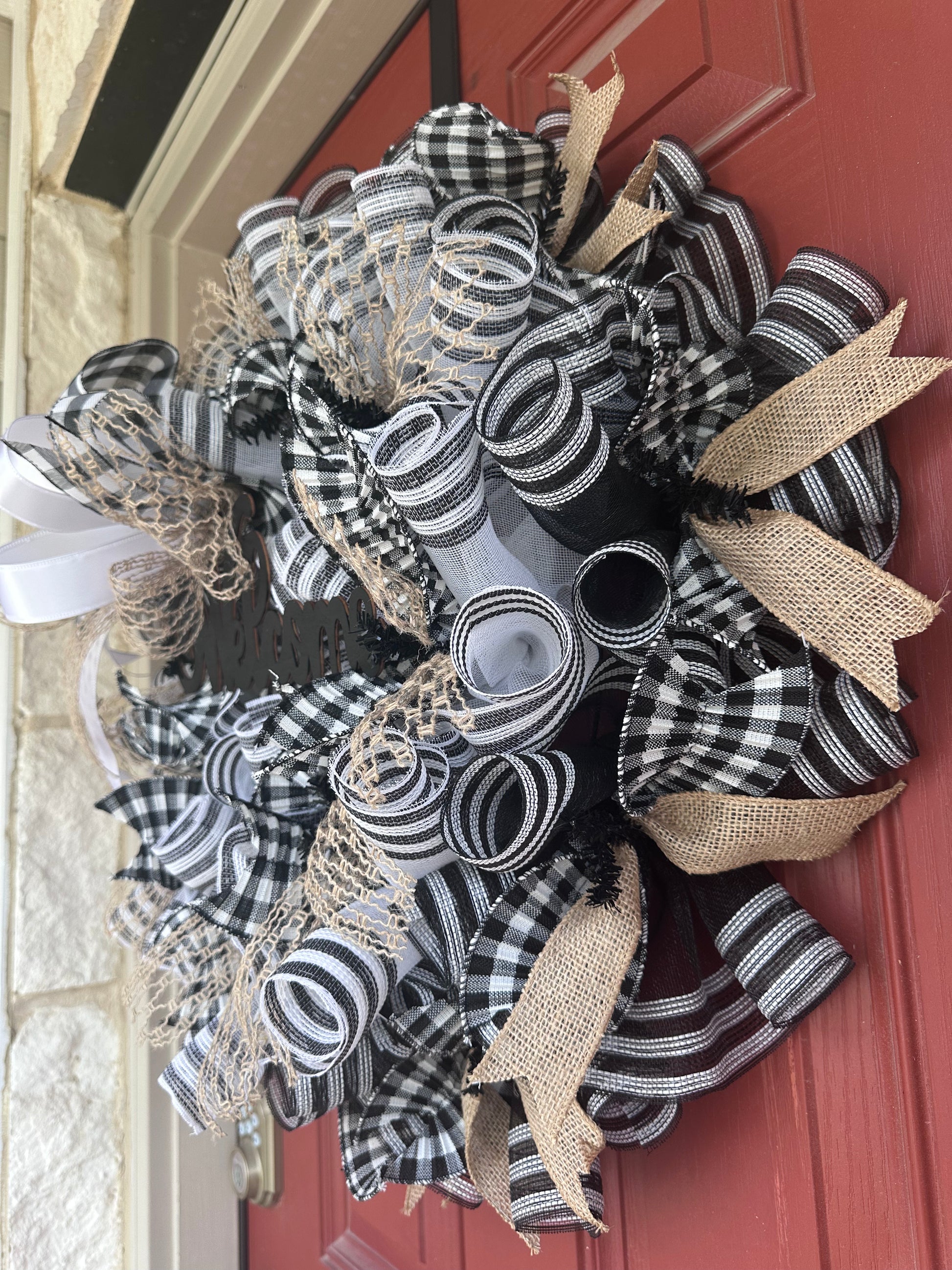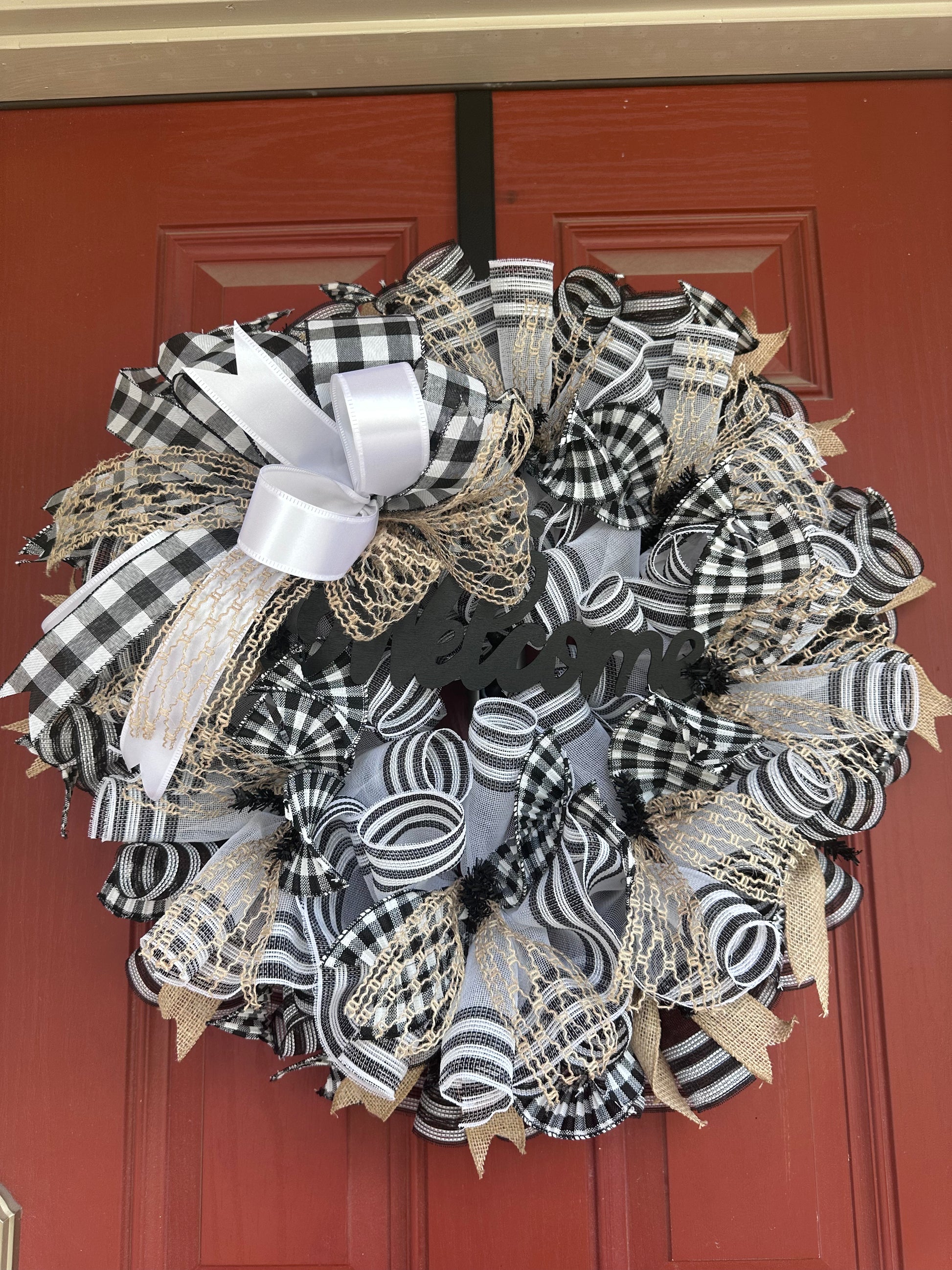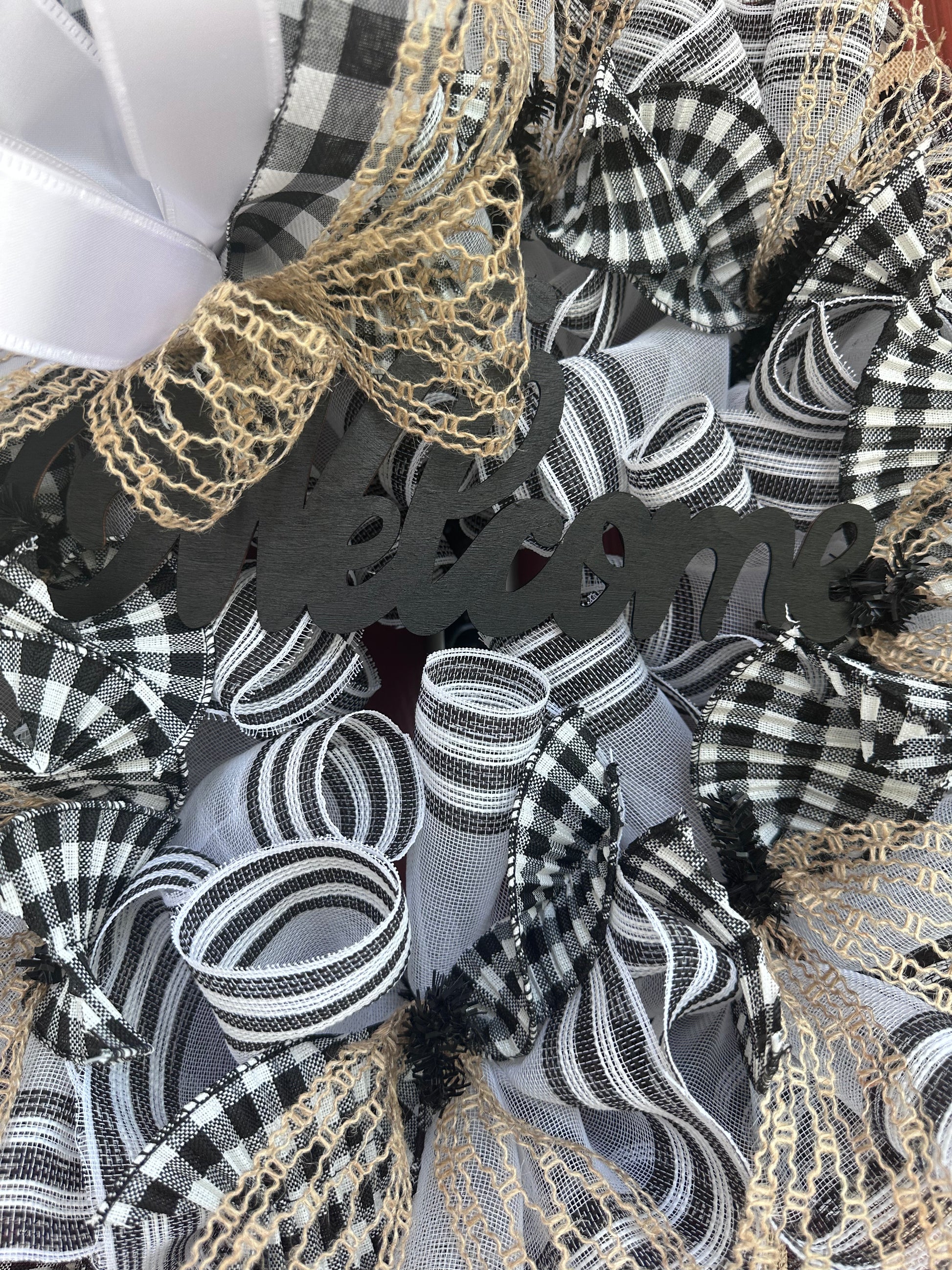 This Welcome Wreath is the perfect way to greet guests with a touch of elegance. Featuring a stylish black and white "Welcome" sign, this wreath adds a sophisticated touch to any door or entryway. Make your home feel inviting and welcoming with this beautiful wreath.